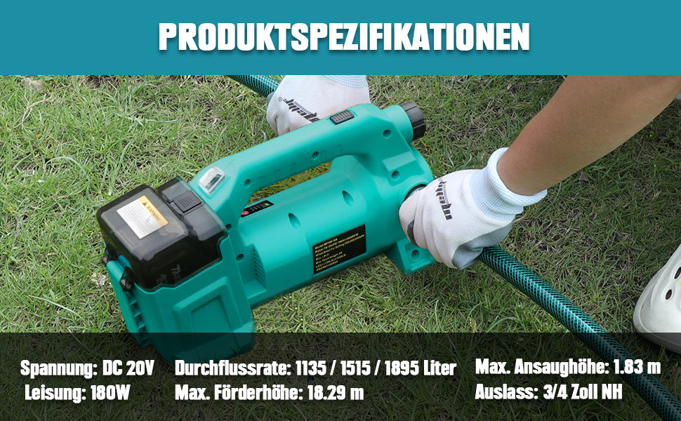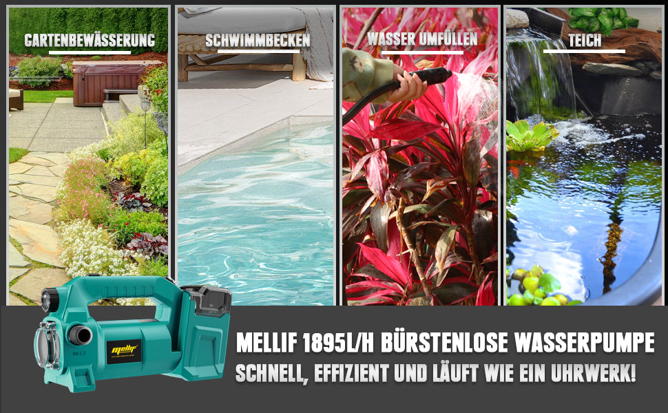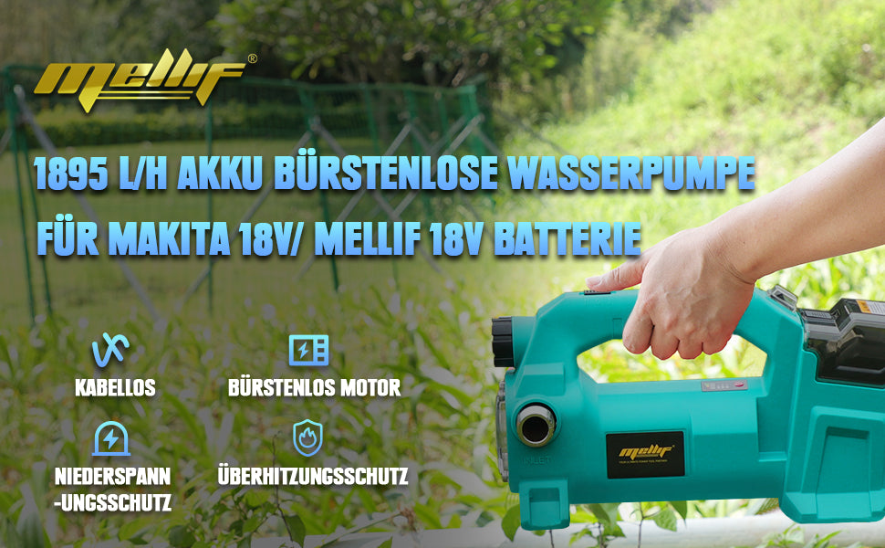 - Lieferumfang: Wasserpumpe, Mellif 2,0Ah Akku, Mellif 2,0A Ladegerät